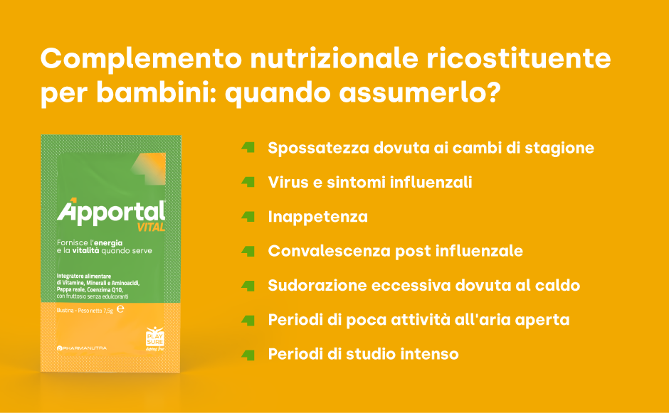 Il complemento nutrizionale Apportal® Vital contiene vitamine e minerali formulati per aiutare l’organismo dei bambini (e non solo) a ristabilire il livello ottimale di vitamine e minerali. Inoltre aiuta a sostenere il sistema immunitario e a ritrovare forza e vitalità in caso di convalescenza e periodi particolarmente debilitanti. Infatti Apportal® Vital contiene 19 nutrienti, tra cui elementi potenziati dalla tecnologia Sucrosomiale®, brevetto esclusivo di Pharmanutra S.p.A., che ne aumenta la tollerabilità, migliorando di conseguenza assorbimento e biodisponibilità.